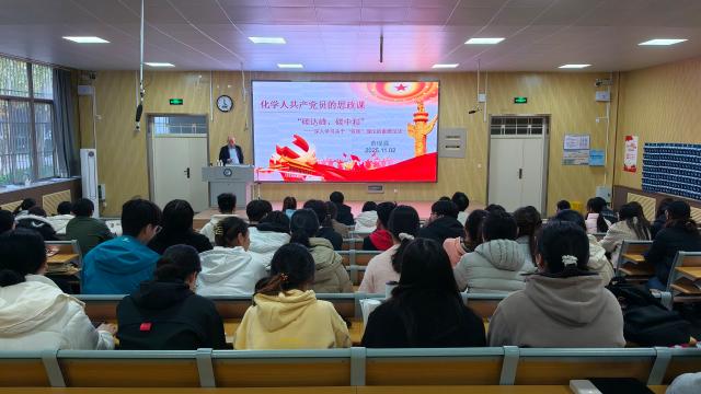 黄现强围绕“碳达峰和碳中和的意义、为什么要实现碳达峰和碳中和、怎么样实现碳达峰和碳中和、我们能为碳达峰和碳中和做些什么”四方面展开讲解,从国家战略高度阐述了碳达峰、碳中和在推动可持续发展、促进能源结构转型方面的重要作用,结合化学化工学科特点,分析了当前在产业结构、能源效率和技术创新等方面面临的挑战。他强调,实现“双碳”目标是一项系统性工程,需要将绿色理念融入科研创新与日常实践,作为入党积极分子,更应主动担当,将专业学习与国家战略需求紧密结合,充分发挥党员的先锋模范作用,为实现“双碳”目标注入青春动能。