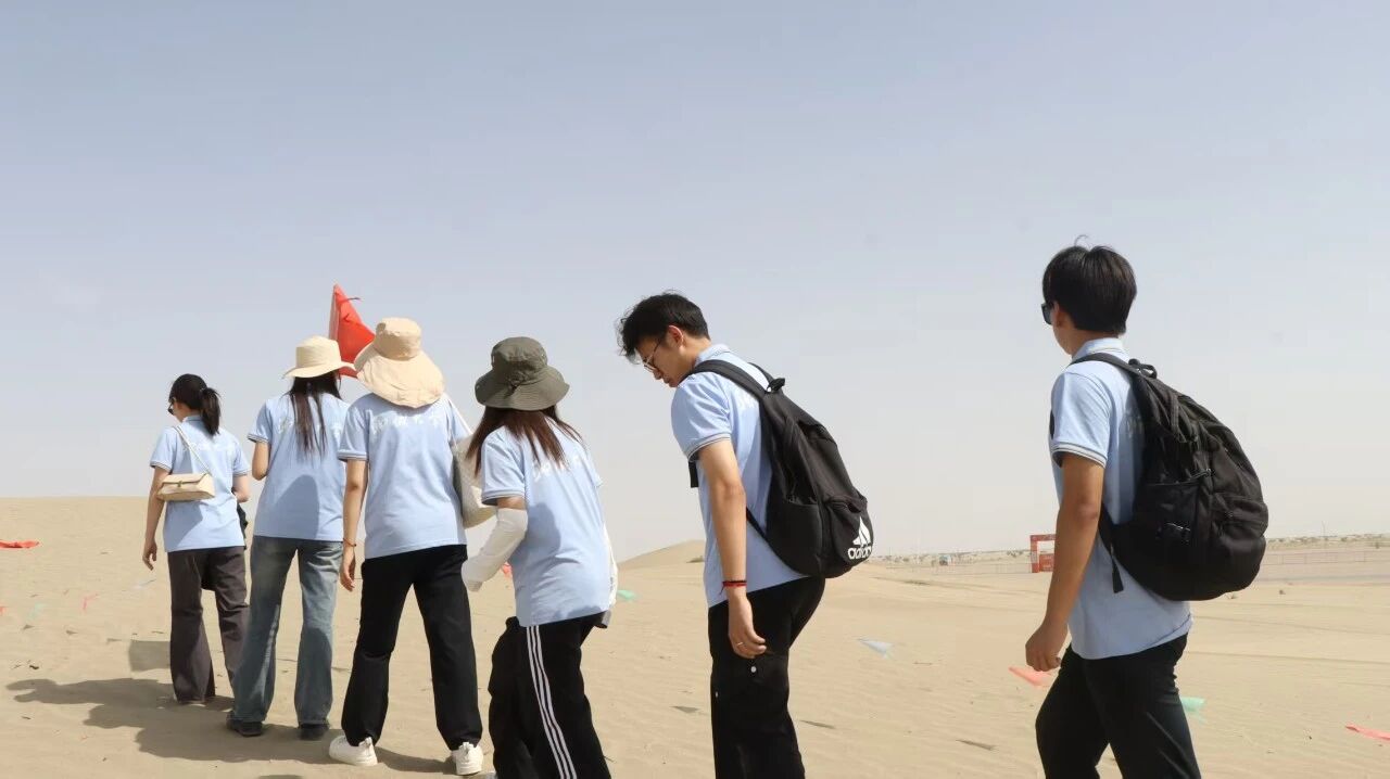 在塔克拉玛干沙漠景区,金色沙丘连绵起伏,热浪扑面而来,成员们望着无垠沙海,仿佛看见1949年沙海老兵负重前行的坚毅身影,真切感受到他们穿越“死亡之海”的非凡勇气与顽强意志。最后,实践团开启五公里“重走沙海老兵路”行程。烈日灼沙,黄沙漫天,实践团成员们肩扛旗帜,步伐坚定,无畏风沙与酷暑,以沙海老兵的钢铁意志为指引,沿着当年老兵进军和田的部分路线奋勇前行。穿越连绵沙丘的亲身体验,让那段充满艰难险阻却又光辉不朽的征程变得无比真切,进一步深化了成员们对“热爱祖国、无私奉献、艰苦创业、开拓进取”老兵精神内核的理解。丹心映照屯垦志,赤子情牵戍边路。此次实践不仅是一堂生动的红色教育课,更是一次深刻的思想洗礼。同学们在亲历中深切体悟到红色江山的来之不易,无不为军垦前辈的奋斗精神所感召。大家纷纷表示,要将个人理想融入国家发展伟业,让不朽的老兵精神在新时代焕发光彩,为边疆建设与民族复兴贡献青春力量。